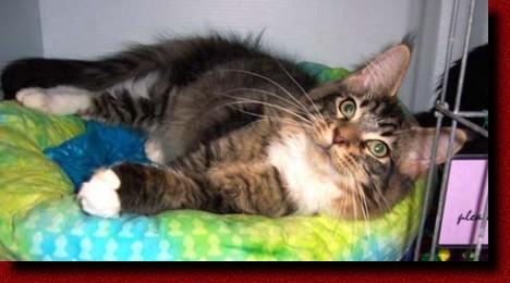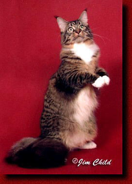 I have to note several special thanks for this miracle boy of mine - firstly to Becky & Dave Lovall who allowed his sweet-tempered and strikingly gorgeous grandmother to come and live with me, GC Coonwyck Talutah of Moosecoons (my Tally Mousch), then Gene and Gigi Haag for allowing Tally to liaison with GC Smokeycoons Ruff Rider of Cabincoon, which created a dear and beautiful girl, GC Moosecoons Oota Dabun (Bunny), who is BB's mom. On dad's side, Elaine Bowman granted me the privilege of owning and breeding CH Beau-Maine's Nittawosew of Moosecoons (Nita) who went to visit and had a tryst with a truly amazing cat, BW, RW, GC Dorwill Raisin' Kane of Coonalley, DM (big thanks to Elaine Magee!!) and their breeding presented me with GC Moosecoons Red Coon Risin' (Phoenix) who became BB's dad.
