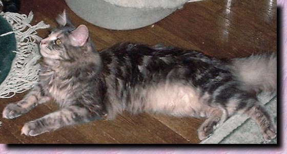 Popsi has been bred to CH Coonwyck Orion of Star Ridge for her second litter. Her babies arrived on December 24th - Christmas Babies! There are 2 cream tabby males, a blue tabby male and a blue tabby female. :-)